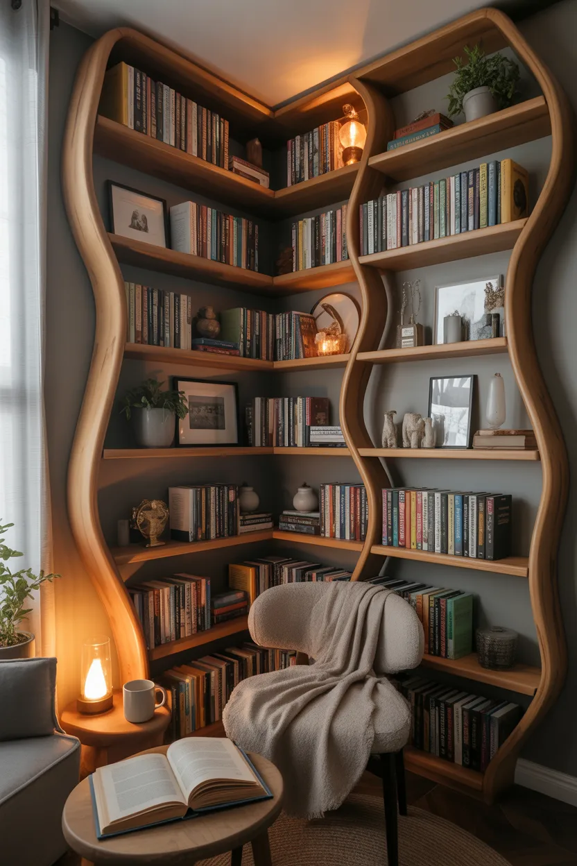 Unused corners can become practical storage areas with the right setup. A tree-style shelf allows you to store books and decor vertically while keeping everything visible. It adds both function and style without crowding the room.