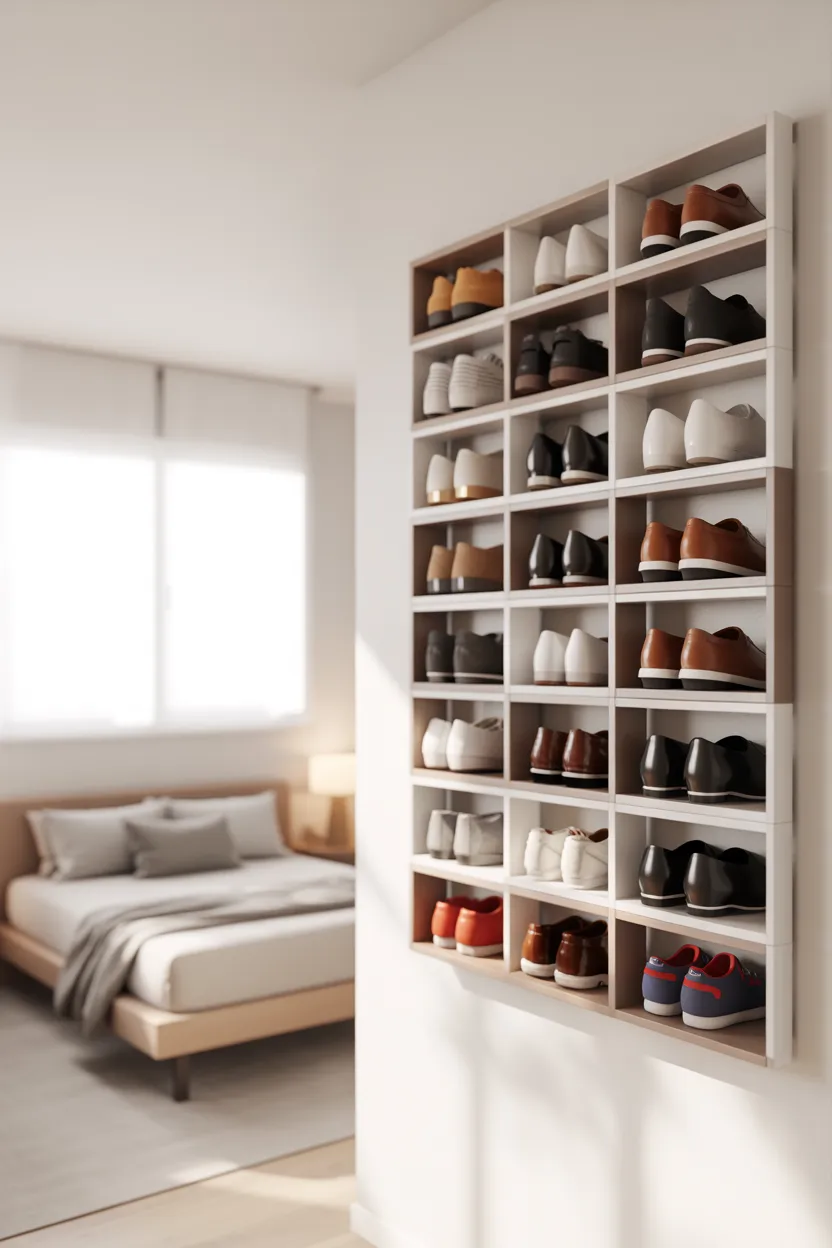 Shoes quickly take over floor space if not organized properly. A vertical shoe wall keeps pairs neatly stored and easy to see. It creates a cleaner look while maximizing wall space.