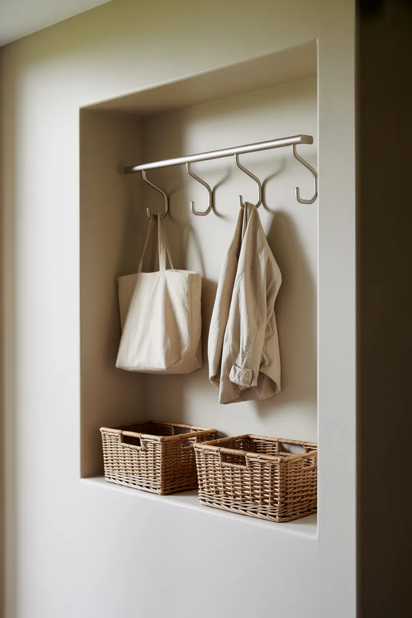 A built-in wall niche can become a ready-made drop zone with minimal effort. Adding hooks and shelves inside the recessed space keeps everything contained and visually neat. Baskets help organize smaller items without creating clutter.