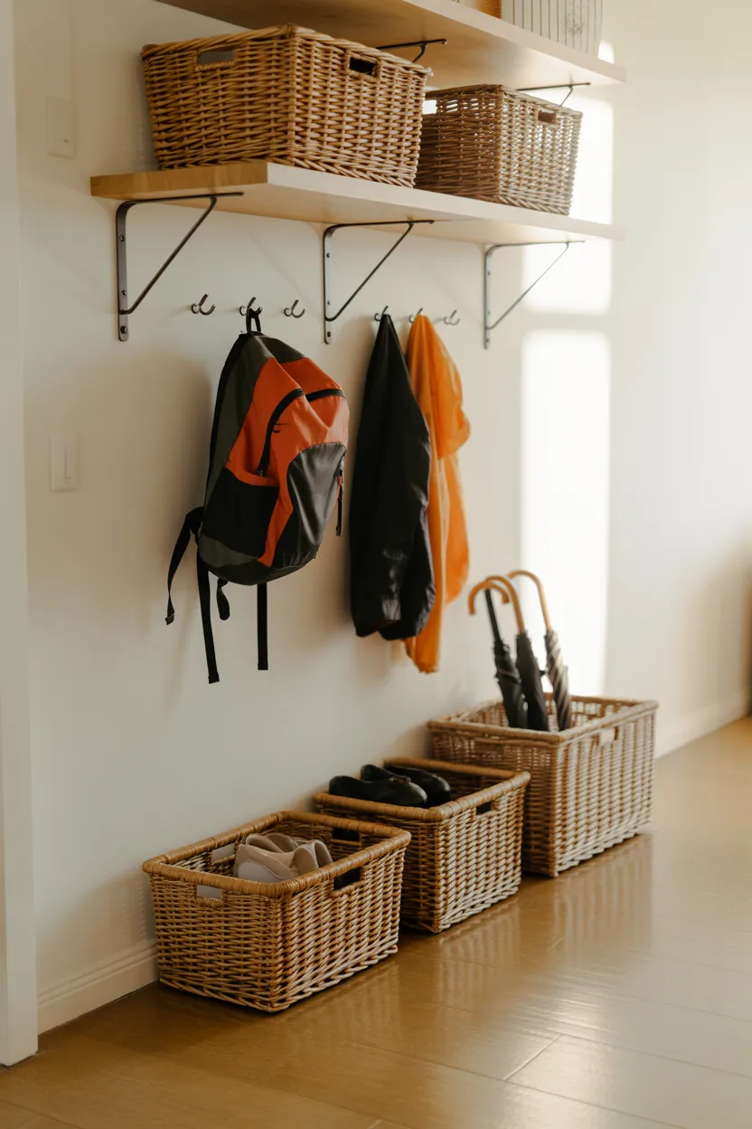 Layering your storage helps avoid piling everything in one place. Hooks handle jackets and bags, while shelves above store seasonal items in baskets. A small surface nearby keeps keys and everyday essentials from getting lost, and a bench with cubbies below keeps shoes organized and off the floor.
