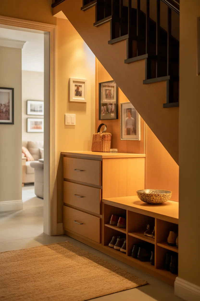 The space under the stairs can easily become a compact drop zone. A small surface for keys and drawers for hidden storage keep things organized without adding bulk. Lighting can also make the space more inviting and practical at night.