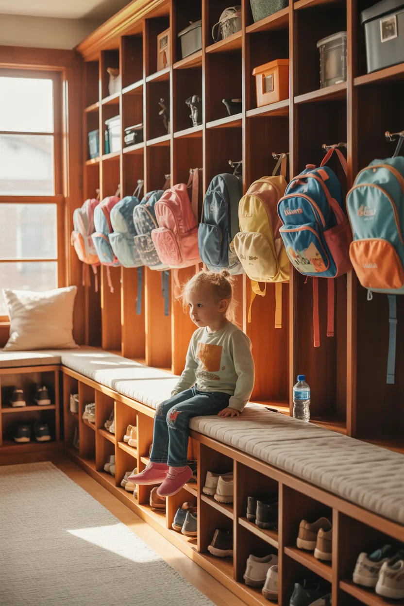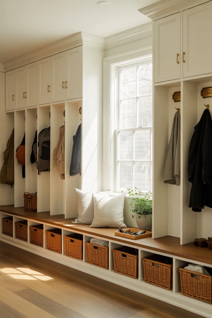 A locker-style setup combines cabinets, hooks, and seating into one organized system. It keeps clutter hidden while making daily items easy to access. This approach works especially well for busy households.
