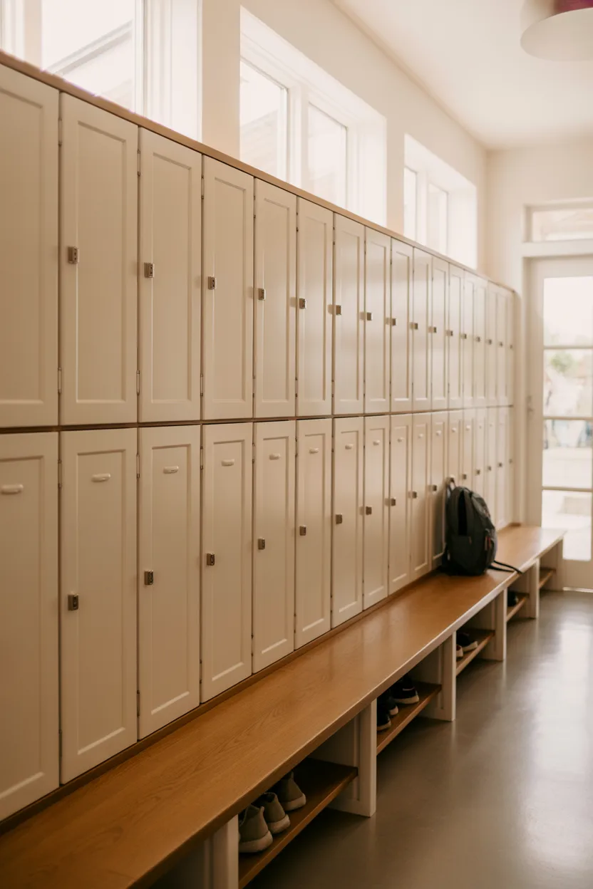 For larger families, long lockers provide enough space for everyone. Each section keeps belongings separate, while a continuous bench adds comfort. Storage baskets below help keep smaller items neatly contained.