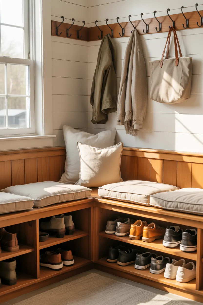 Turning an unused corner into a bench area creates a practical drop zone without taking up extra space. Hooks above keep essentials within reach, while storage underneath keeps shoes organized and visible. It’s a simple way to make the most of overlooked areas.