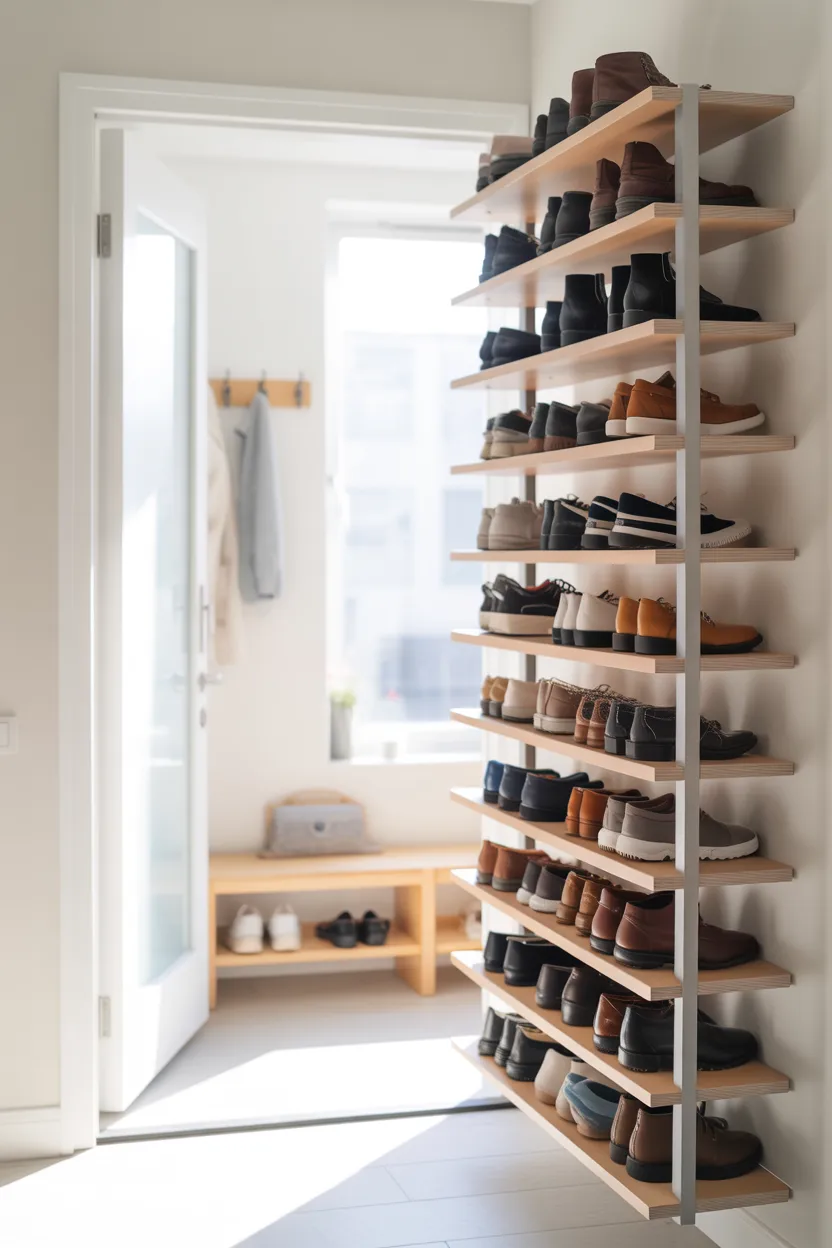 A dedicated shoe wall solves one of the biggest entryway problems—scattered footwear. Vertical shelves allow you to store more shoes without using extra floor space, while nearby hooks keep bags and coats organized in one place.