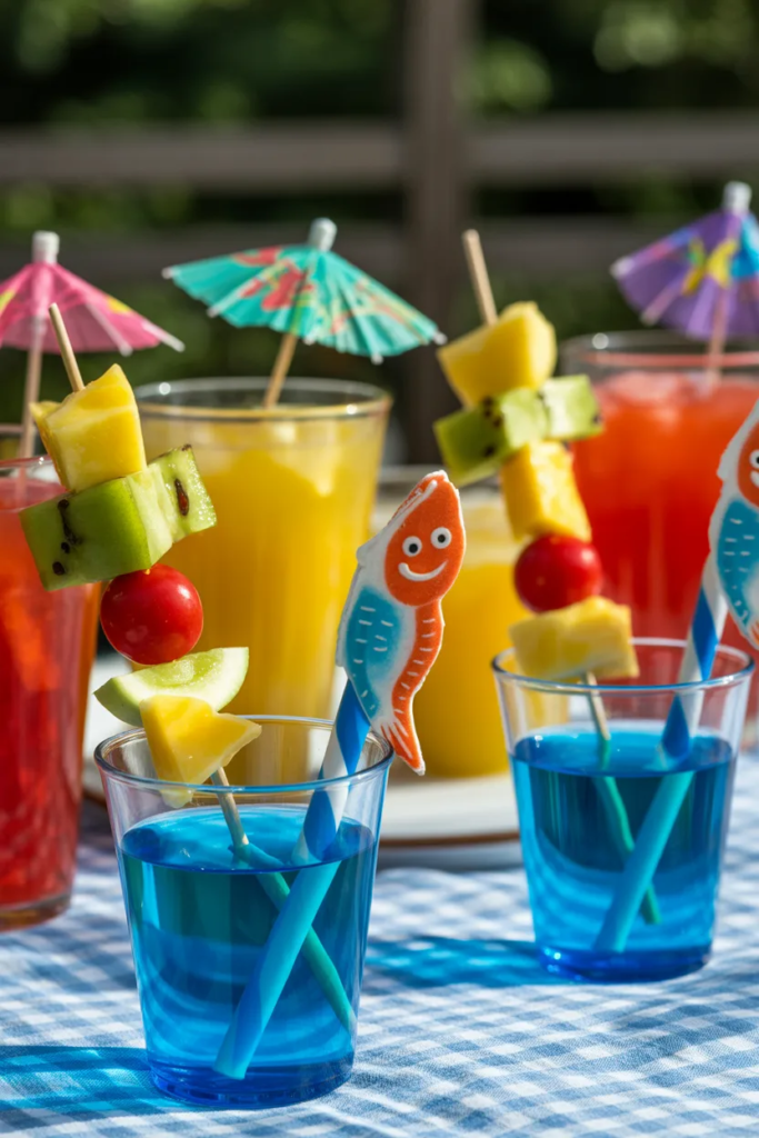 Think blue jelly cups with candy fish, fruit skewers with a tropical look, or cupcakes decorated like beach balls. Drinks can be just as fun—serve juices in clear cups with tiny umbrellas or even small buckets for a playful touch.