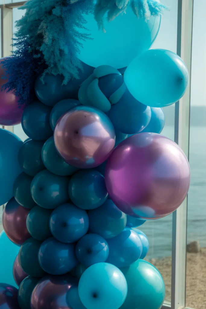 Use coral shapes, shiny textures, and layered decorations. Balloons in shades like teal and purple help create that “deep sea” feel. This setup works well for slightly older kids who enjoy a more immersive theme.