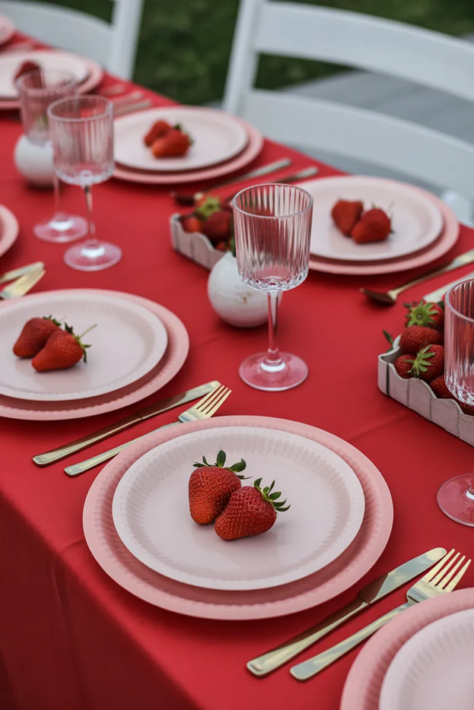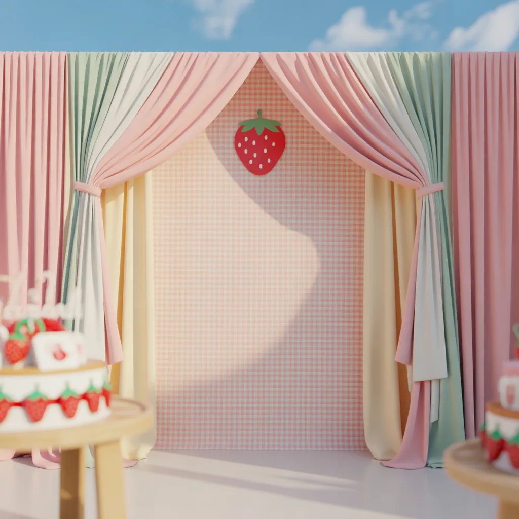 I use a gingham backdrop when I want an instant strawberry vibe. It creates a strong visual base without needing too many extra elements.