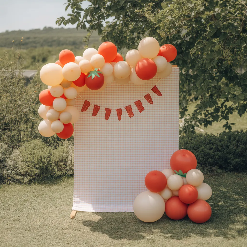 outdoor strawberry party setup in garden, gingham backdrop, soft balloon cluster on one side, natural sunlight, airy atmosphere, realistic colors, close-up decor focus, no text