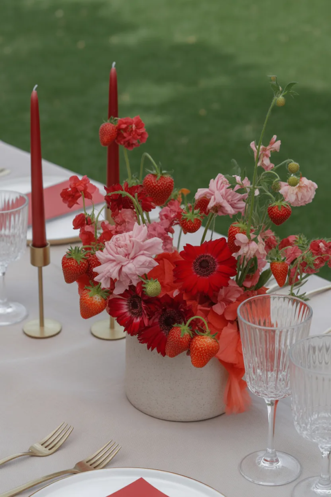 Pro Tip: Mix red and soft pink flowers for a natural feel.