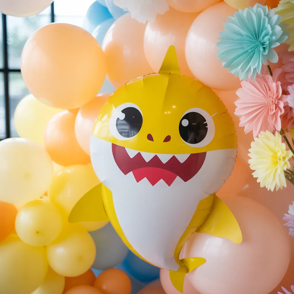 Use pastel balloons with bold floral accents for a fresh take on Baby Shark. Add character cutouts and tiered snack stands.