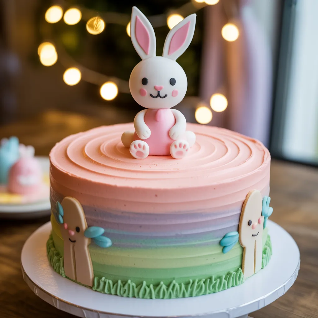 A bunny-themed cake with soft details becomes the centerpiece. Keep the setup simple with natural light so the cake stands out.