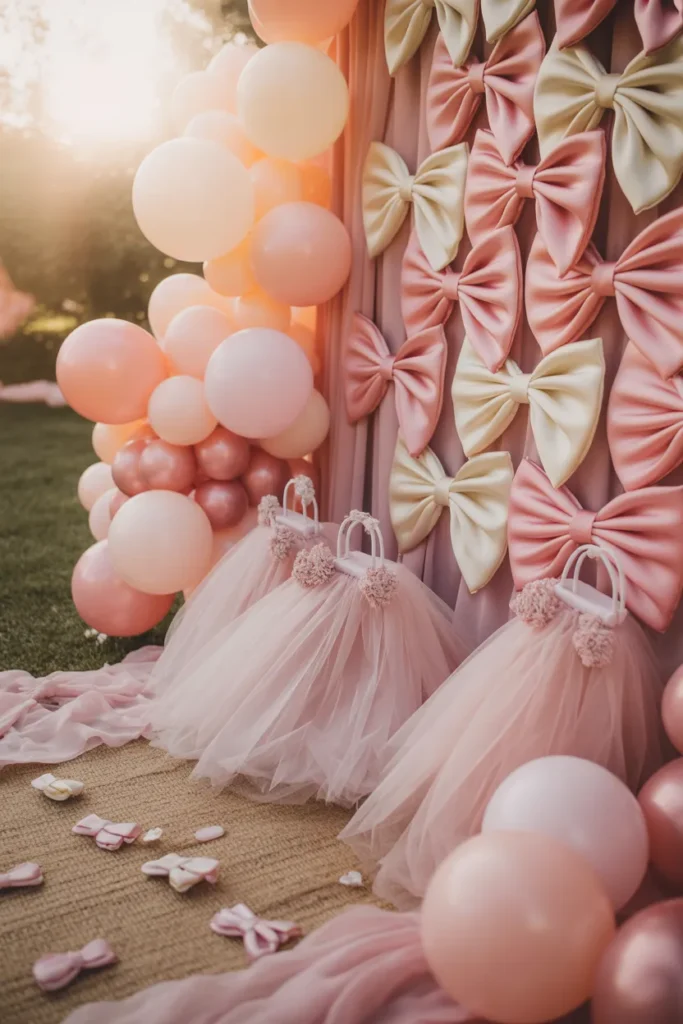 A bow and tutu theme feels soft and girly. Use blush and white balloons with oversized bow accents. Natural sunlight works best, while fairy lights add a dreamy glow in the evening.