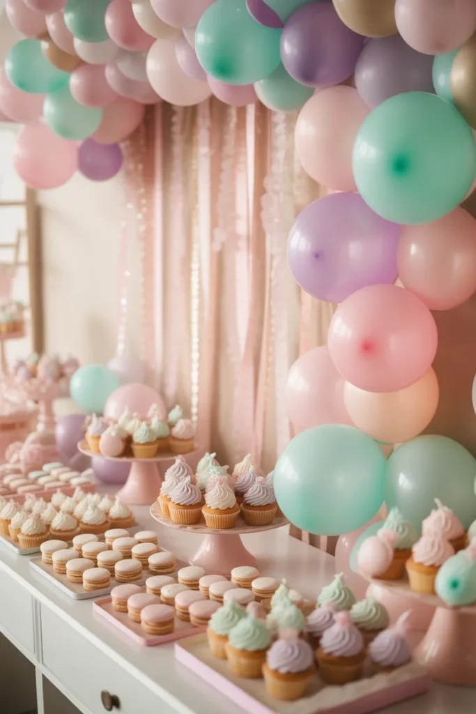 Turn your food table into the party centerpiece with a pastel balloon garland and hanging streamers. Use balloons in soft pink, mint, lavender, and gold, and hang ribbons or crepe streamers behind the table. Add fairy lights or LED strips above the setup to make everything glow.