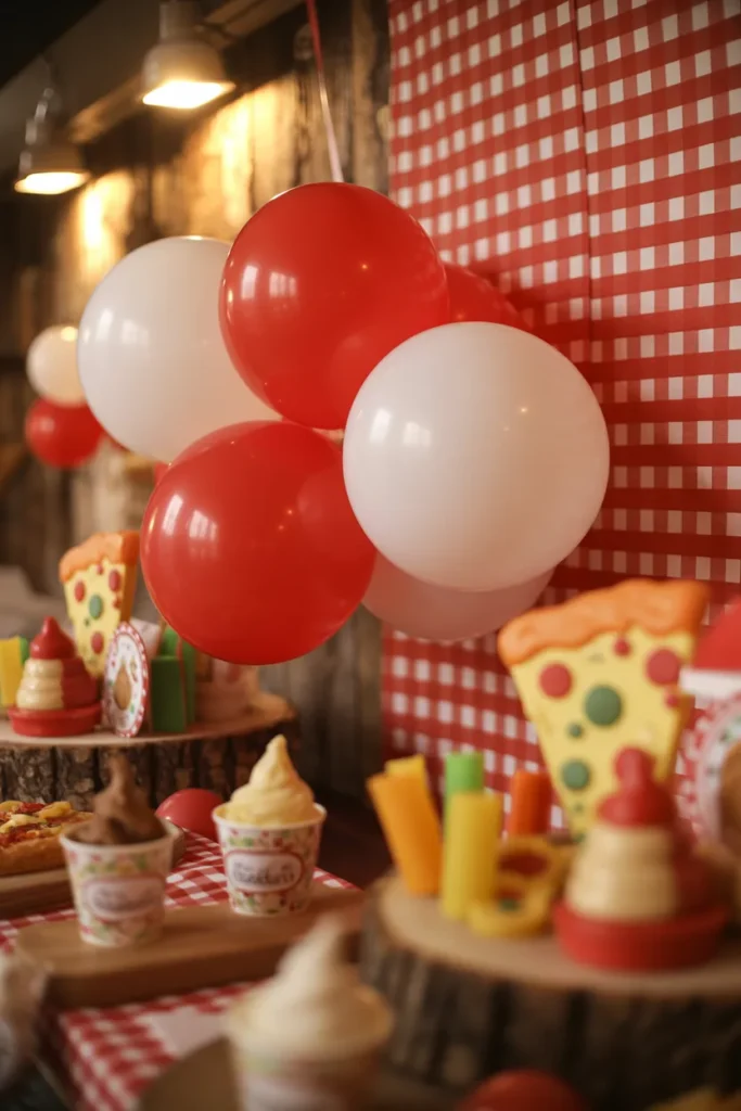 Use red and white balloons, a gingham backdrop, and greenery for a playful Italian vibe. Add a marquee “2” and warm lighting to enhance the colors.