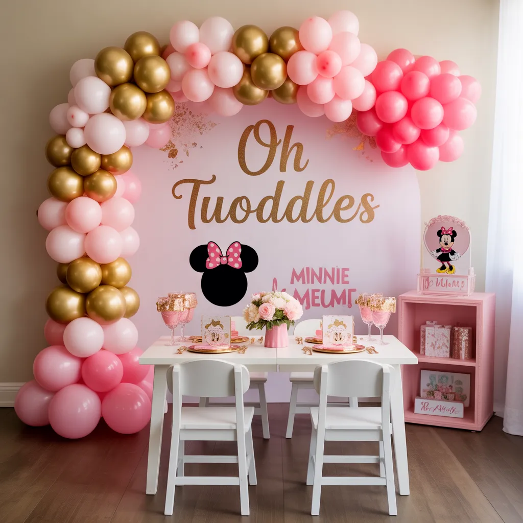 This classic theme uses pink, gold, and white balloons with Minnie accents. Add a “pick your ears” station for fun and favors.