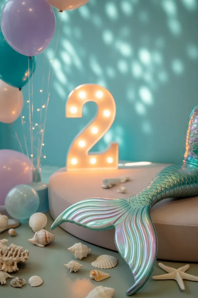 A mermaid theme adds instant magic with pastel balloons and seashell accents. Use lavender, teal, and pink balloons, add a mermaid tail cutout, and place the cake on a pedestal. A marquee number with warm bulbs adds an undersea glow.