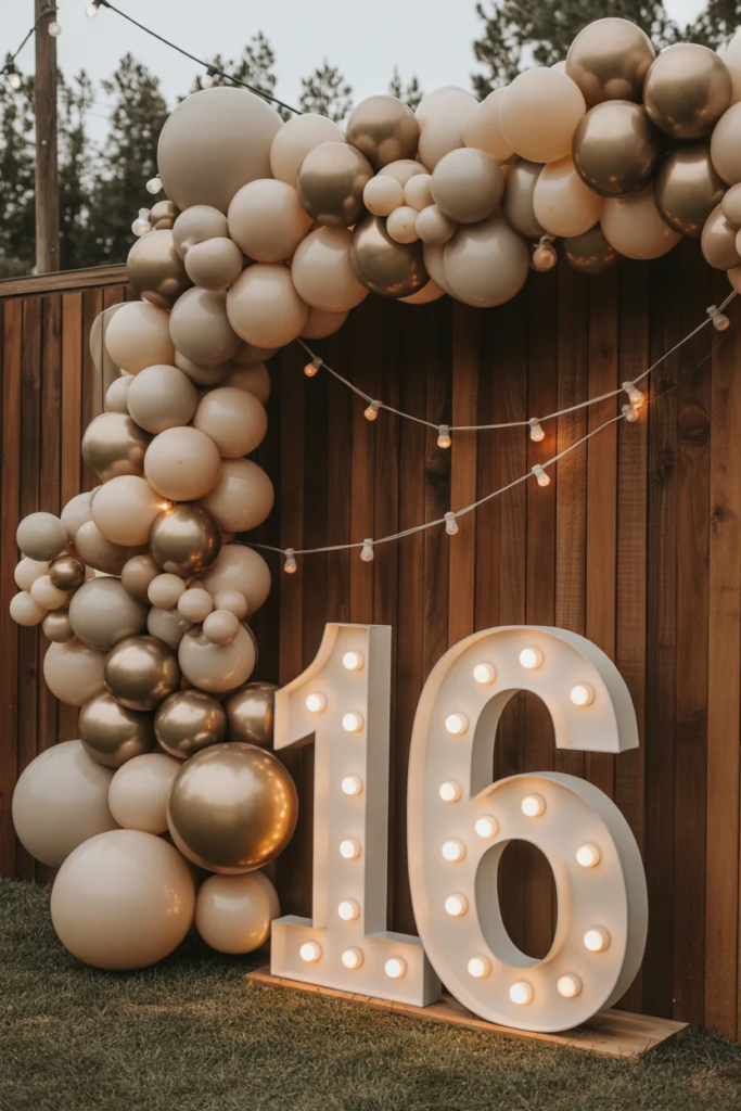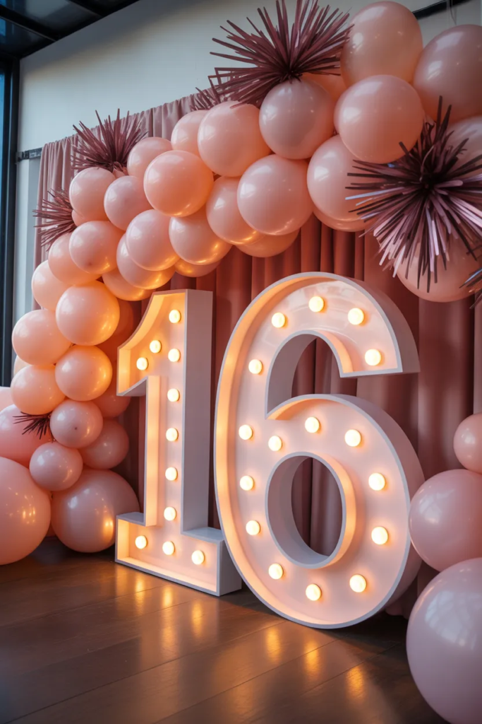 Use large “16” lights and surround them with pink and metallic balloons. Mixing textures like ribbons or foil balloons adds more depth.