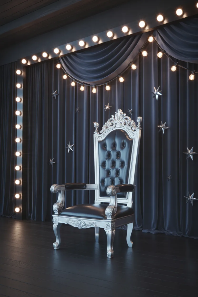 Dark backdrops, silver accents, and soft lights create a magical effect. Adding a central chair or stage area makes it ideal for photos.