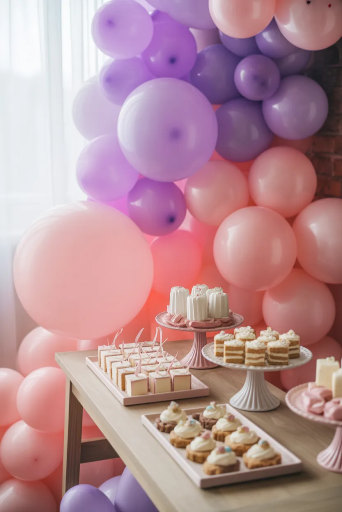 Blending pinks, purples, and whites keeps the look balanced. Adding a dessert table nearby makes the space more functional.