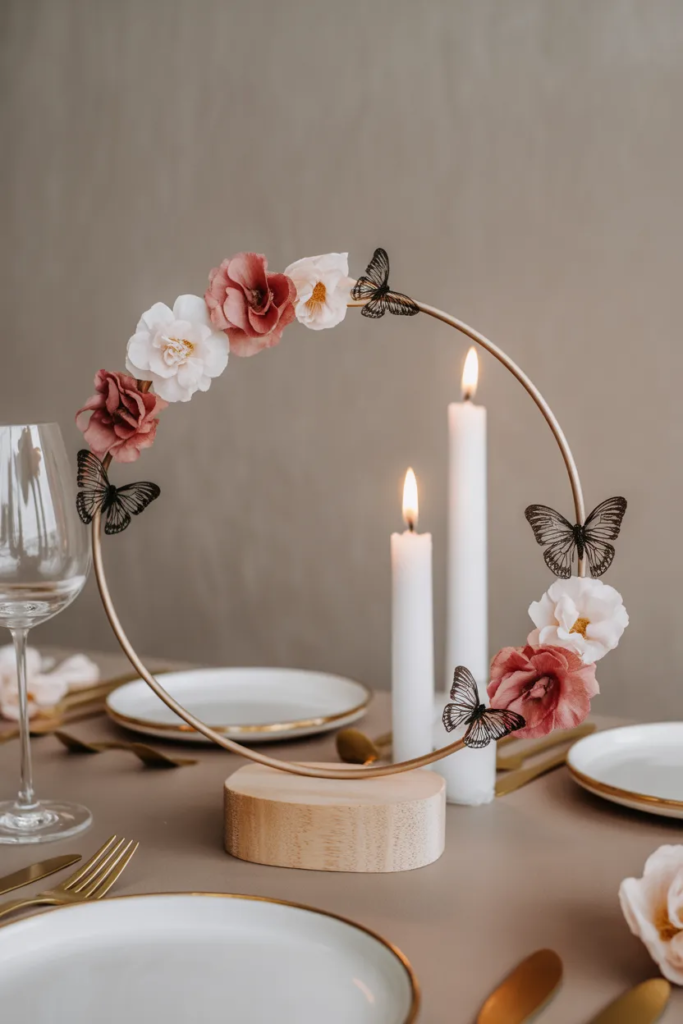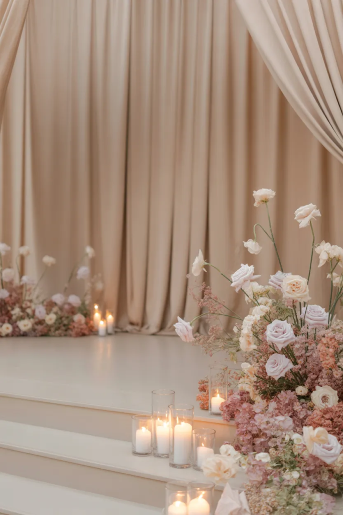 Use matching table settings, floral centerpieces, and themed backdrops. Small details like candles and gold accents make a big difference.