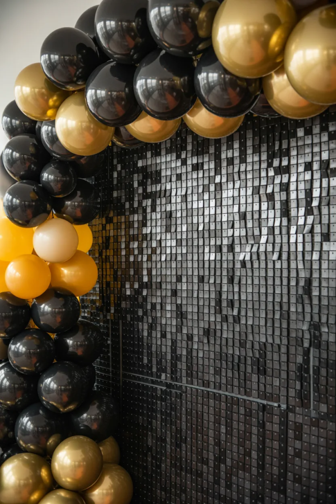 Sequins and balloons together create a glamorous photo wall. It’s perfect for capturing memories.
