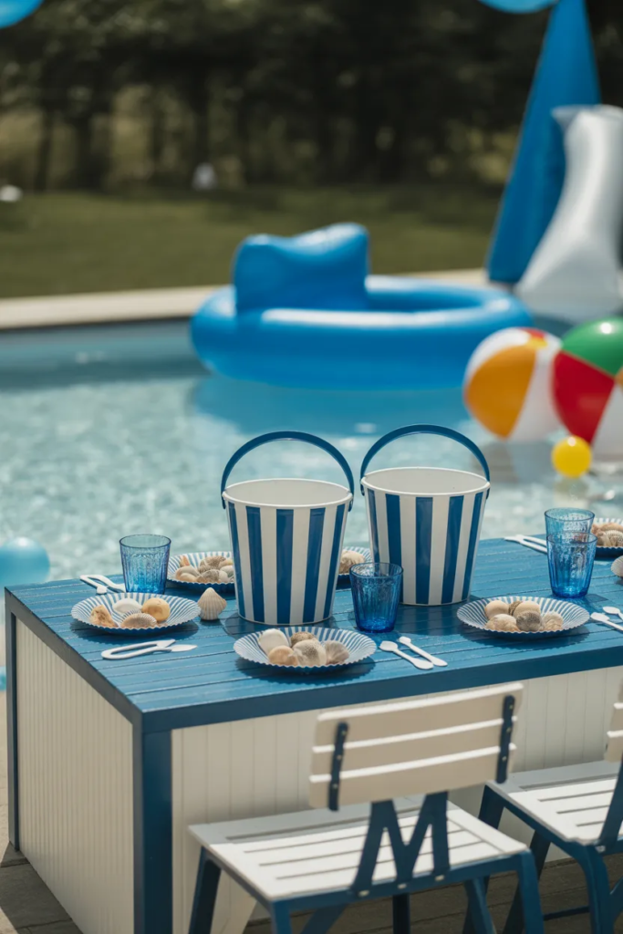 You can also hang simple banners with ocean or summer themes. Blue and white table settings give a “water vibe” without much effort. Adding small items like shells, buckets, or even sunglasses as table props makes everything look more put together.
