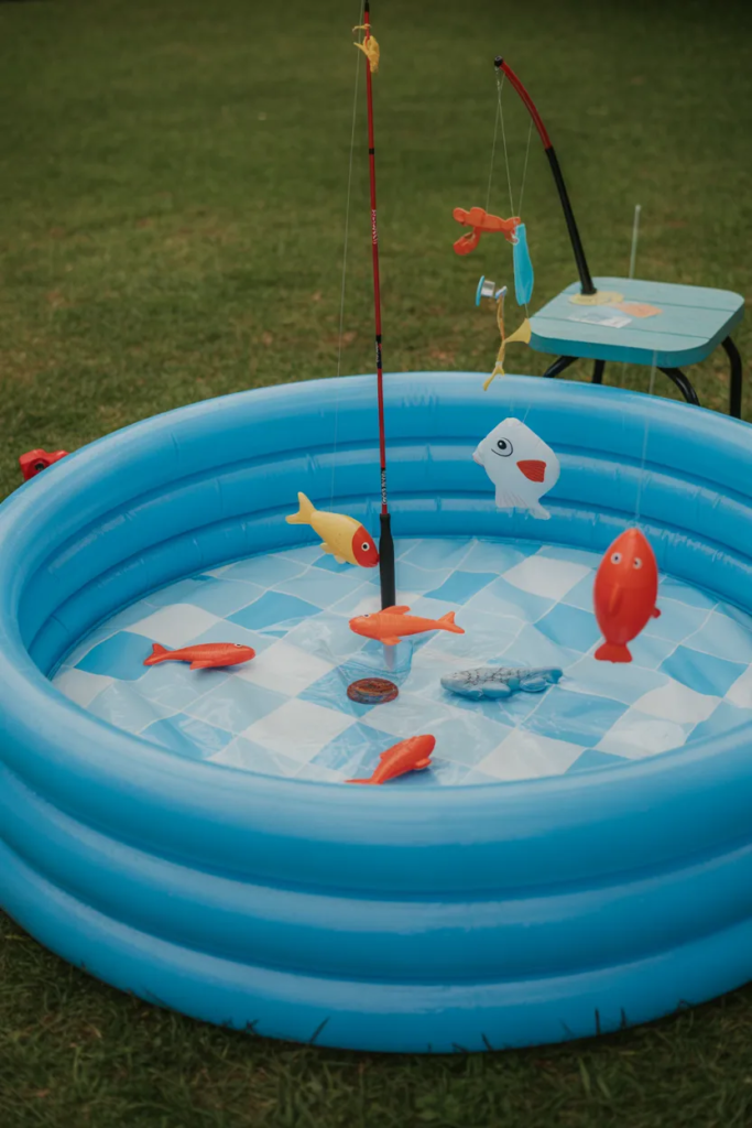 Kids love the idea of “catching” things, even if it’s just plastic fish. Adding a colorful backdrop or sea-themed decorations makes it more exciting and also great for photos.