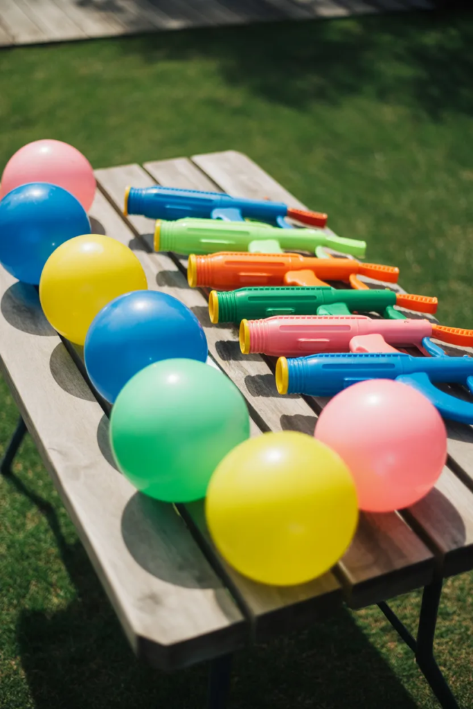 Set up buckets of water balloons, squirt guns, and small water toys. Keeping everything organized in one place helps avoid chaos and keeps the game flowing.