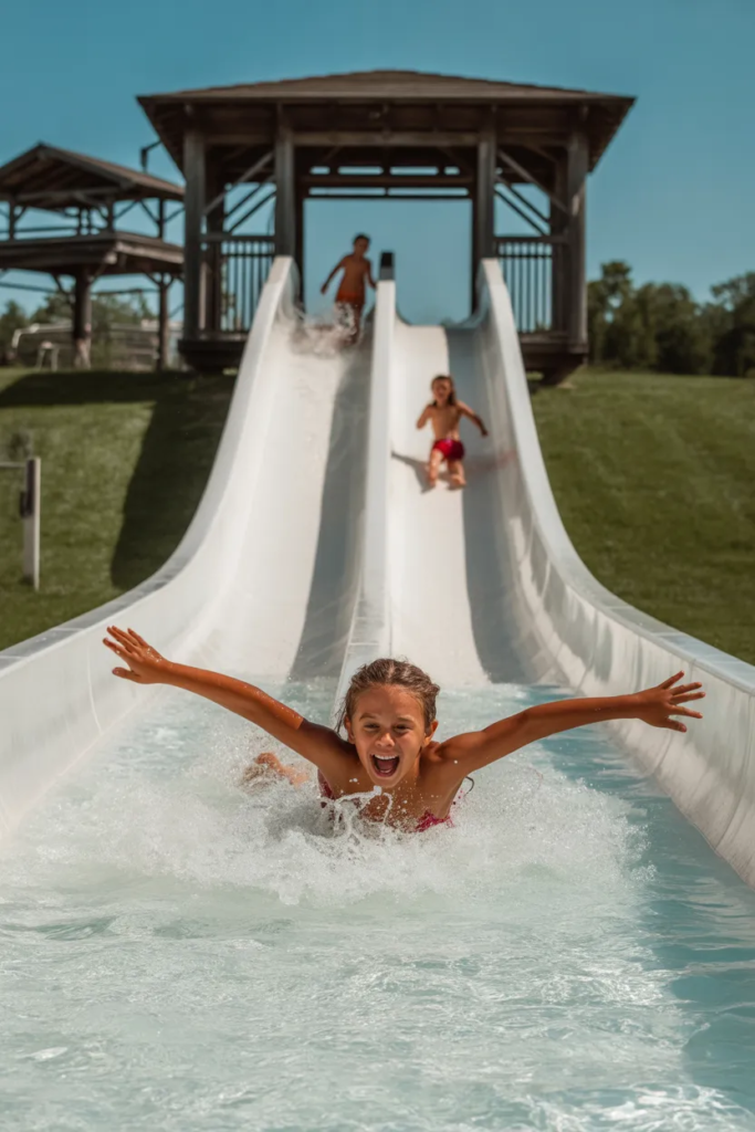 A small setup with slides, spinning toys, and splash areas can keep kids busy for hours without needing constant supervision.