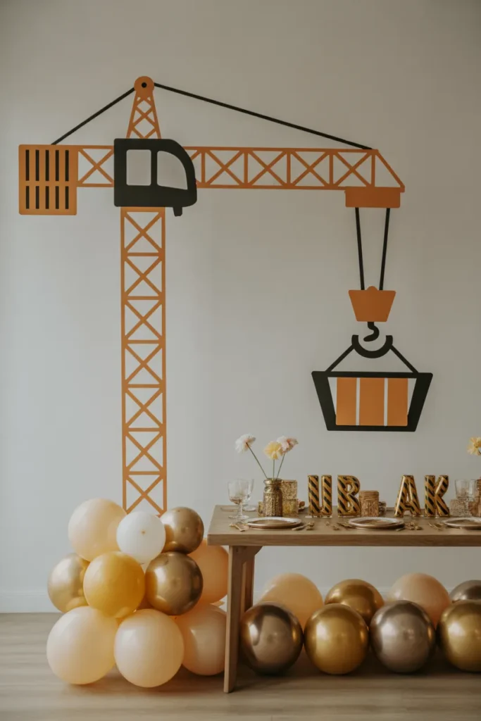 Caution-style visuals instantly grab attention and fit perfectly with the construction theme. Using tape or bold patterns creates a strong visual without needing complex decoration. It’s quick and effective.