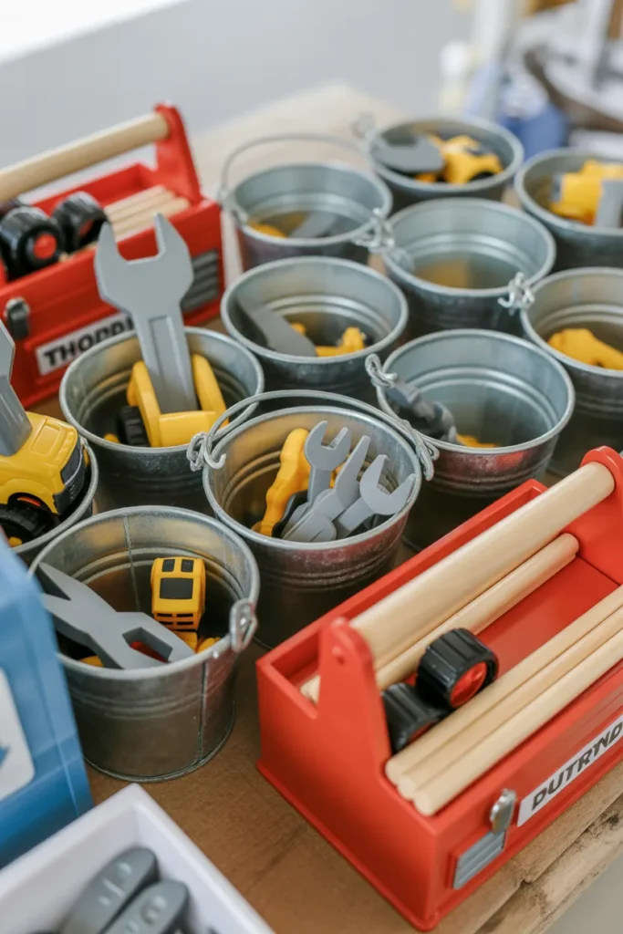 For an excavator theme, this works especially well with items like small trucks, digging tools, or wearable accessories. Keep it simple and useful rather than filling bags with random items. Presentation also matters, so using buckets or toolboxes makes everything feel more exciting and easy to grab.