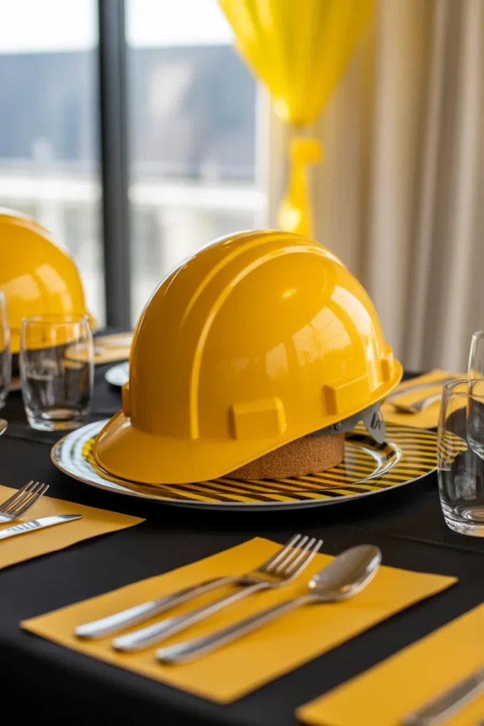 Using construction helmets as plate covers adds a fun surprise element to the table. When kids sit down and lift the helmet, it creates a small moment of excitement that makes the experience feel different. It’s simple but very effective.